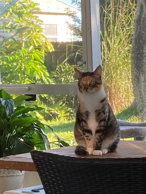 We brought the new kitty home, Sam opened the carrier door. Fur, legs, and tail skedaddled out of sight. First under the lanai furniture, then into the master bedroom. That’s the last we saw of her for almost 24 hours. After hearing plaintive meows the following day, we finally located her standing on a three-inch bed frame between the wall and the headboard.